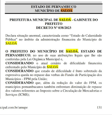 Saloá, localizado no agreste meridional do estado, através do prefeito Rivaldo